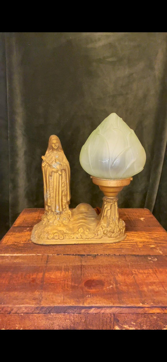1930s Mother Mary Cast Metal Lamp with Uranium Glass Shade – Art Deco Religious Lamp – Glows Under UV – Vintage Sacred Decor
