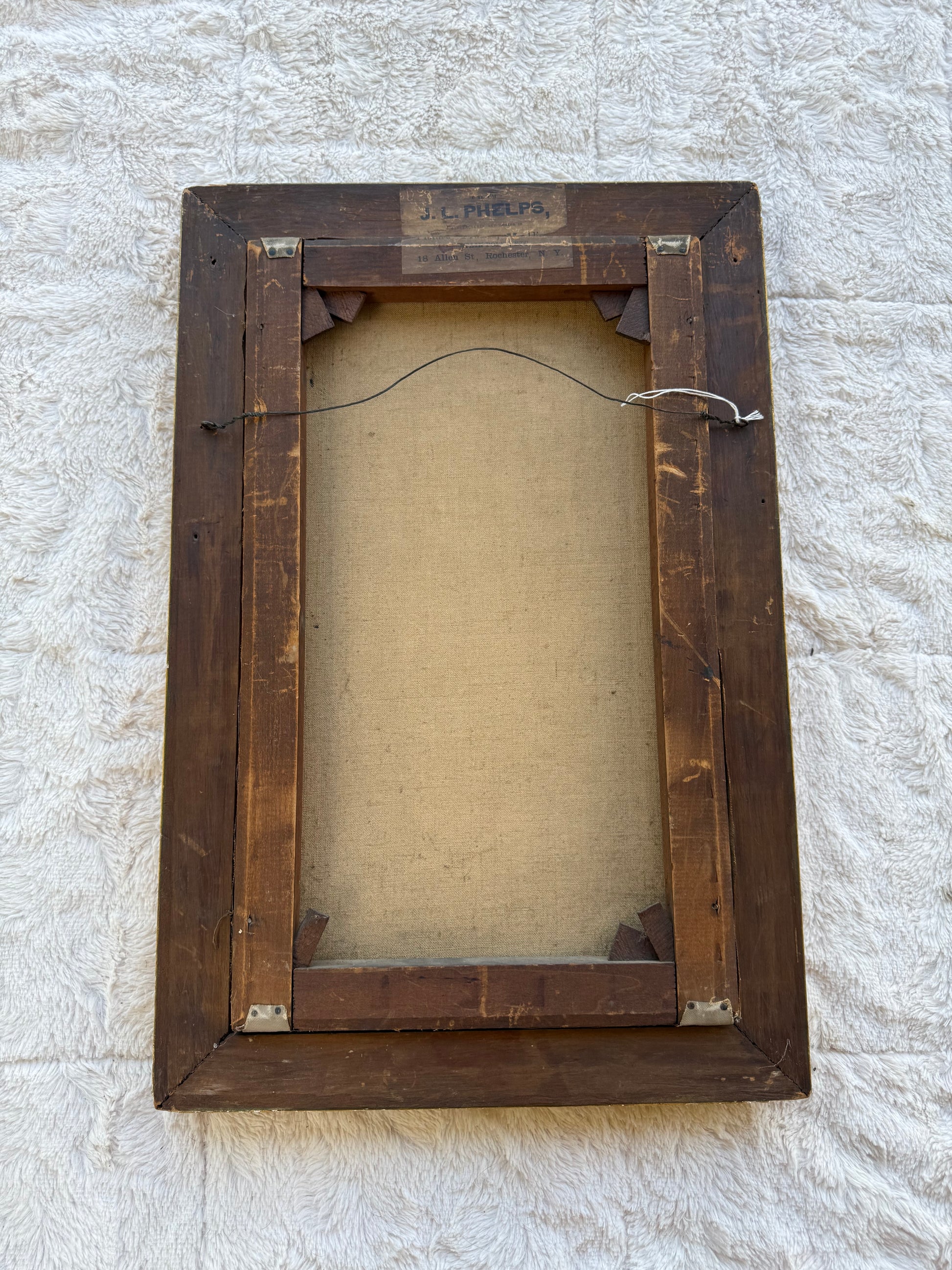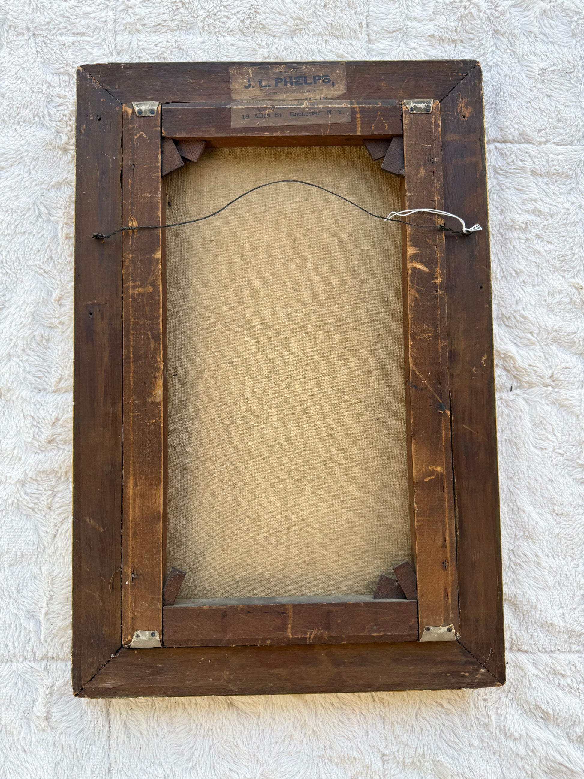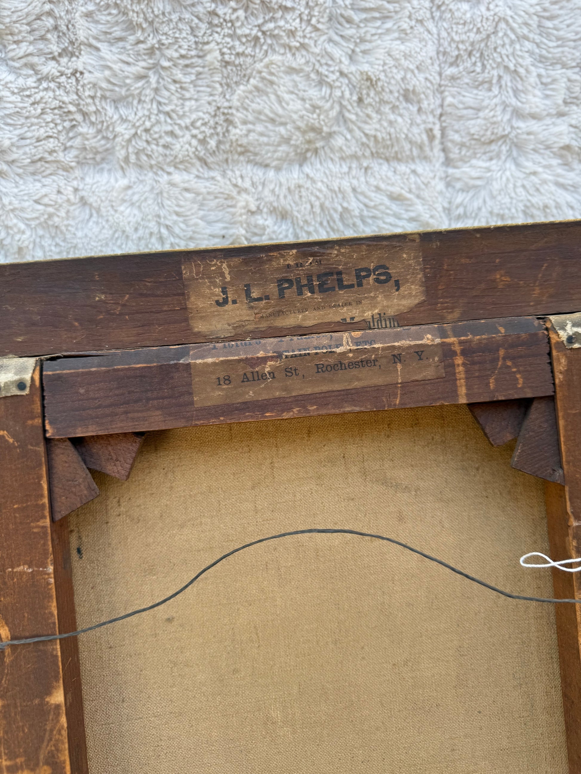 A richly detailed late-19th-century American landscape oil painting on canvas, housed in its original ornate gilt frame. This piece comes from the J.L. Phelps shop of Rochester, New York — a known 19th-century supplier of artists’ materials and picture frames — helping date this work firmly to the 1880–1900 period.