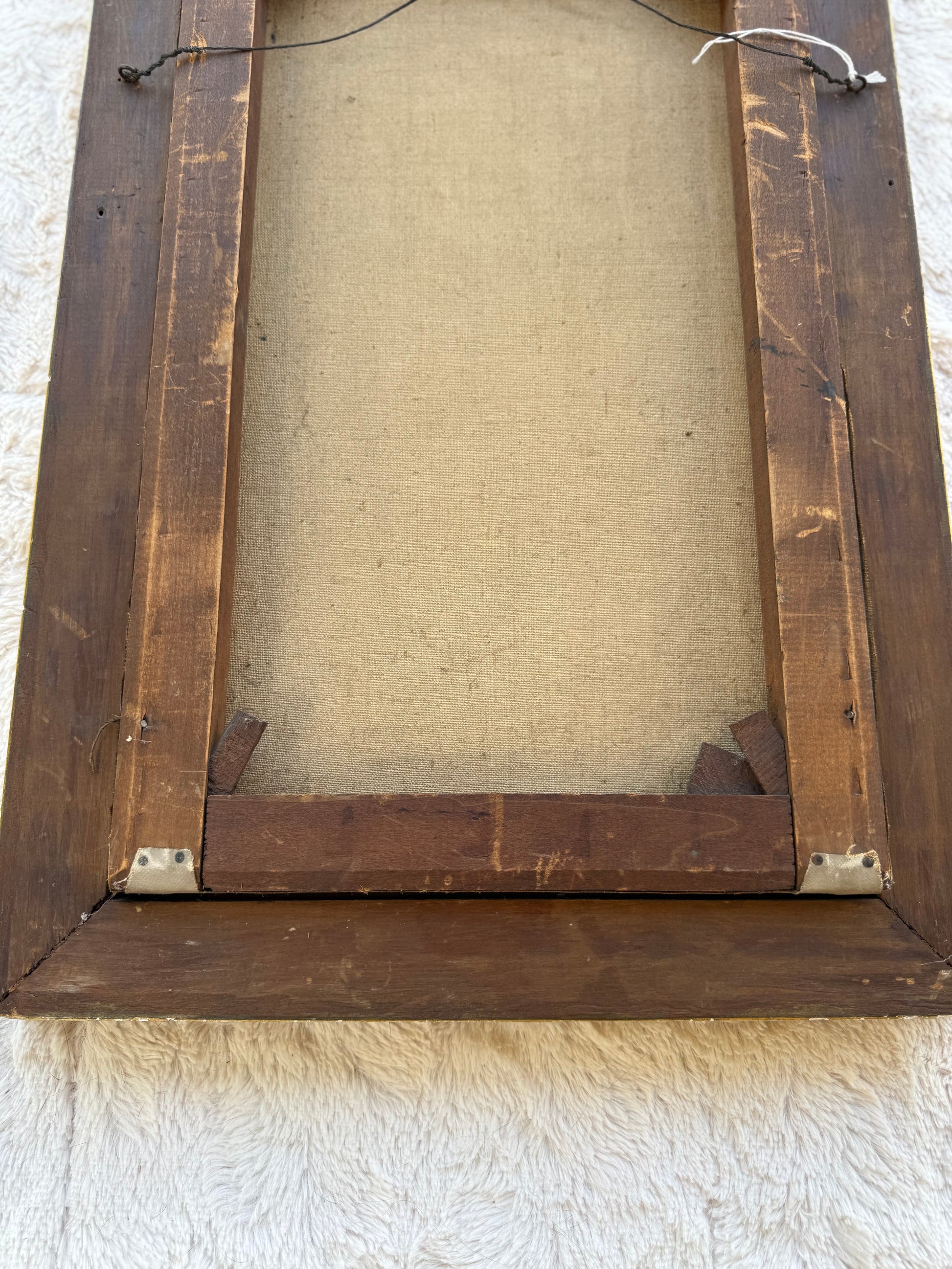Painting is structurally sound with expected craquelure and age toning. The canvas shows scattered tiny flecks of paint loss and a few rubbed or abraded areas typical of 19th-century oils. The original gilt frame has multiple losses to the gesso and gilding, chips, and wear throughout, but still displays beautifully and is secure for hanging. All original stretchers and keyed corners remain intact.