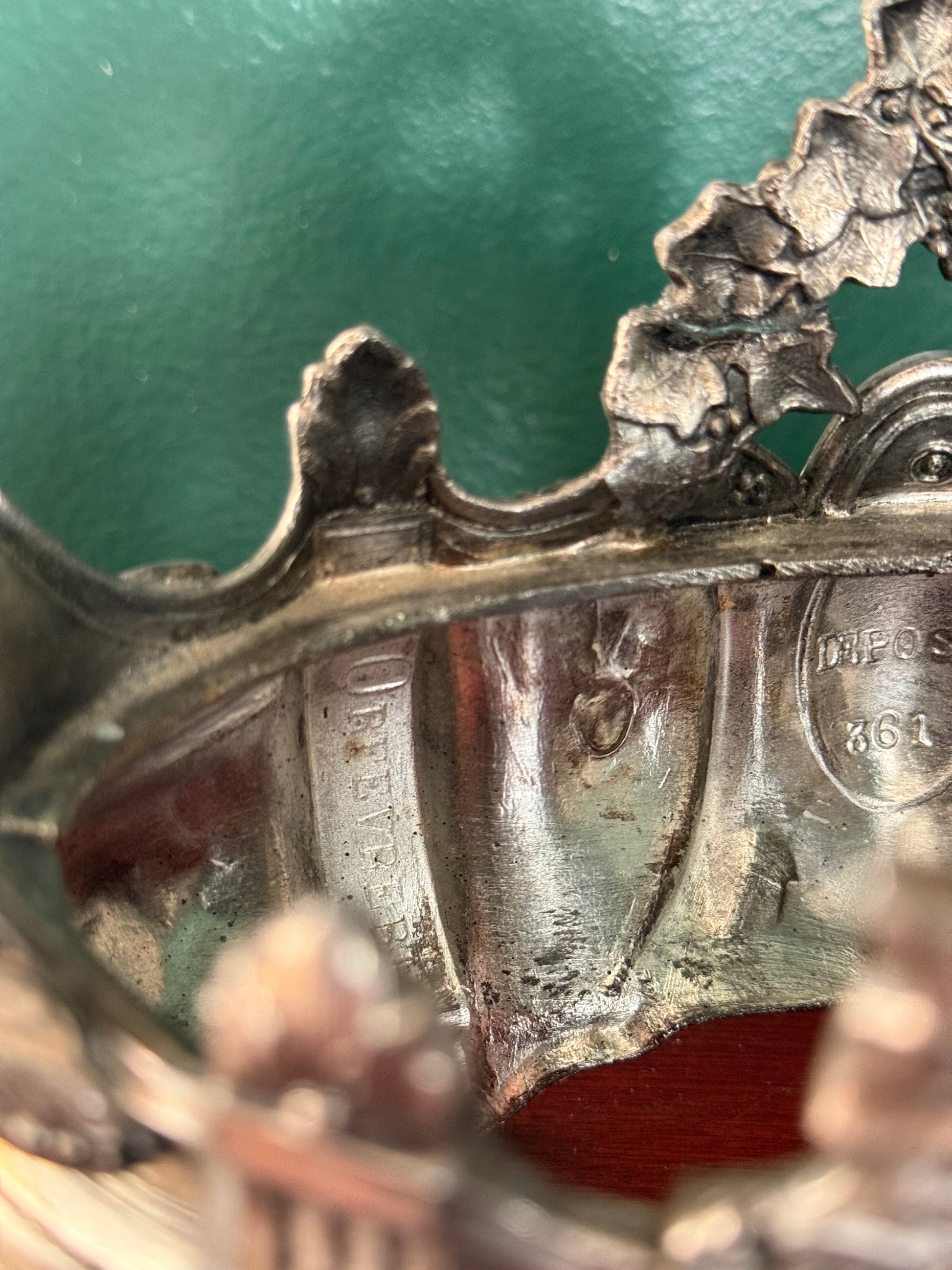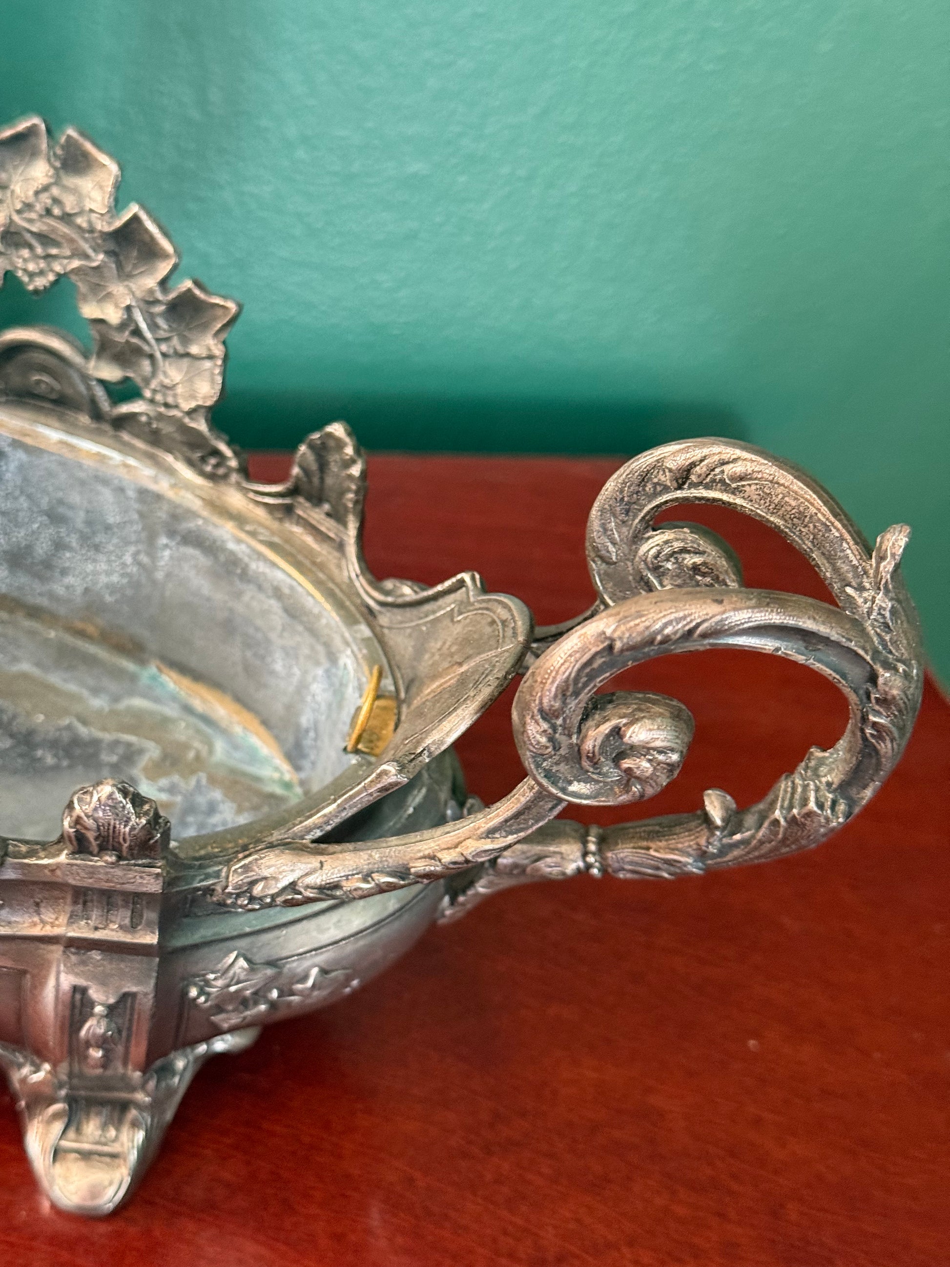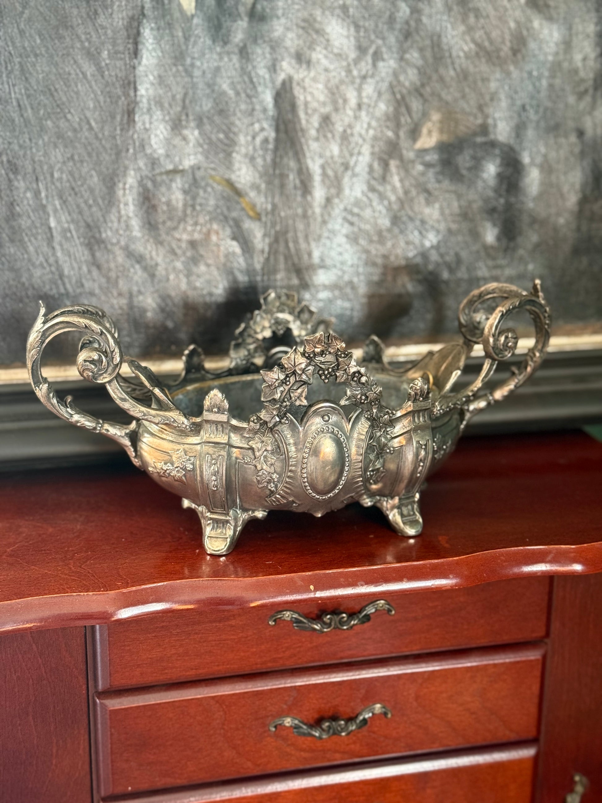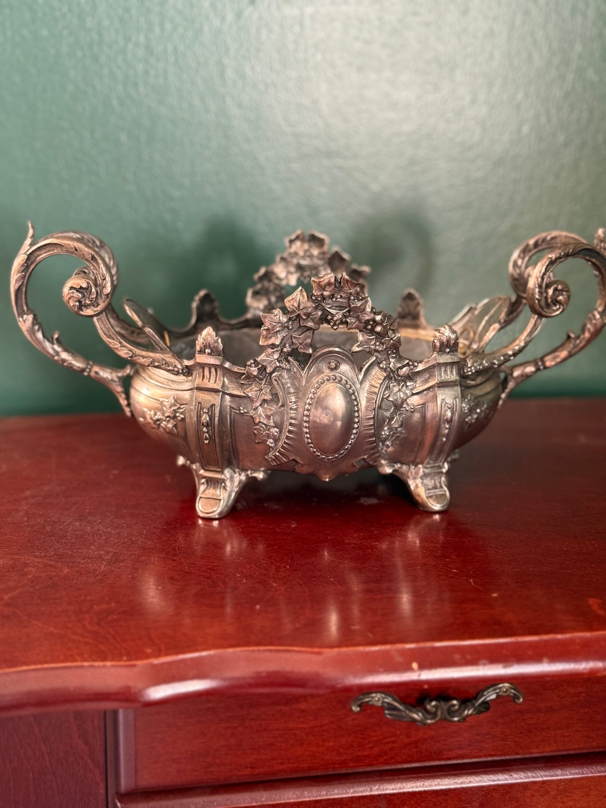 This antique French jardinière dates to the Art Nouveau period, circa 1895–1910, and features sculptural ivy and scrolling handles characteristic of the era’s naturalistic design language. The piece is cast in spelter (white metal) and bears a French “Déposé” mark to the interior, indicating a registered design.