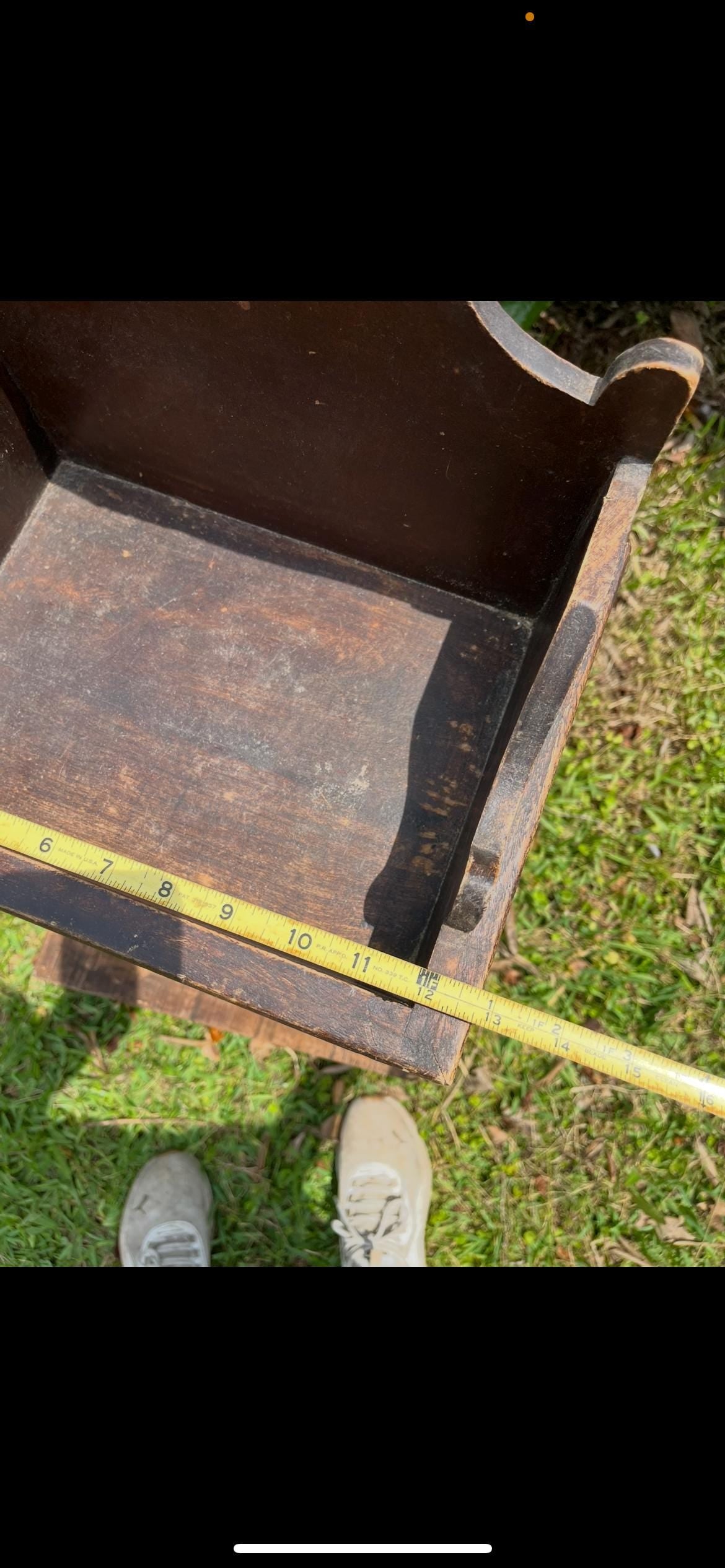 This antique wall-mounted music cabinet features a tall, narrow design with open vertical slots, originally intended for sheet music or periodical storage. Crafted from solid wood and designed to be hung on the wall, it’s a beautiful example of late Victorian to early Arts & Crafts functional furniture.