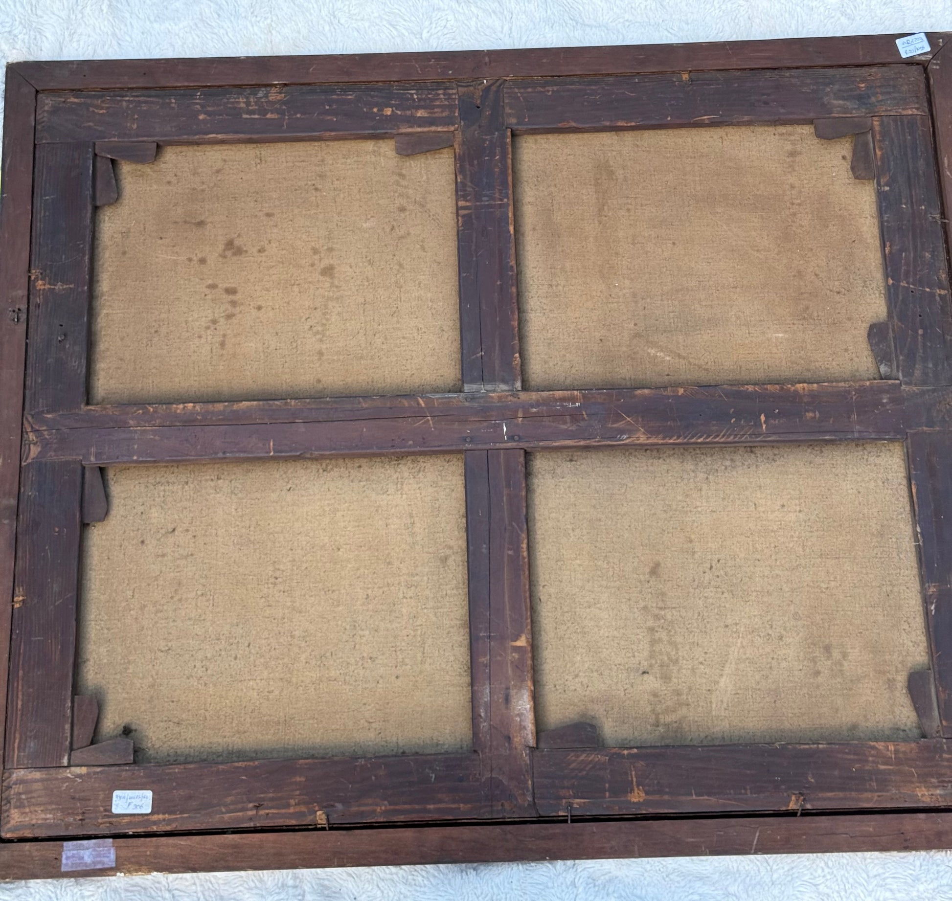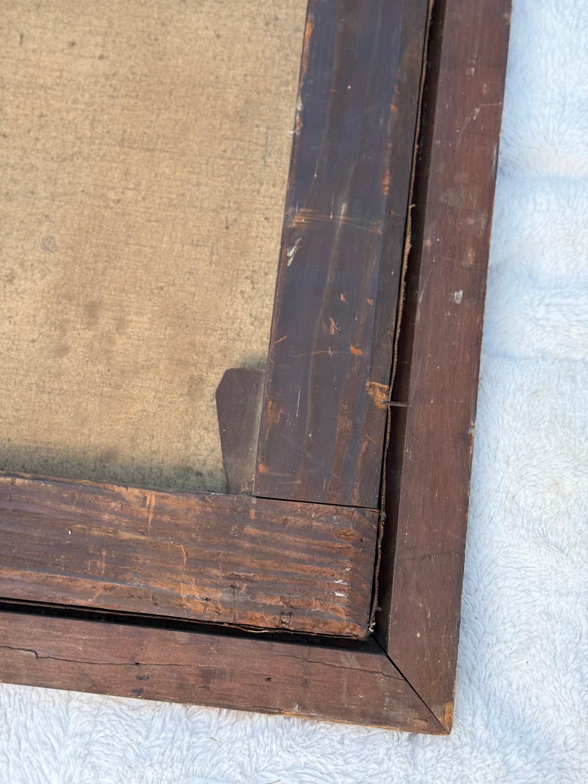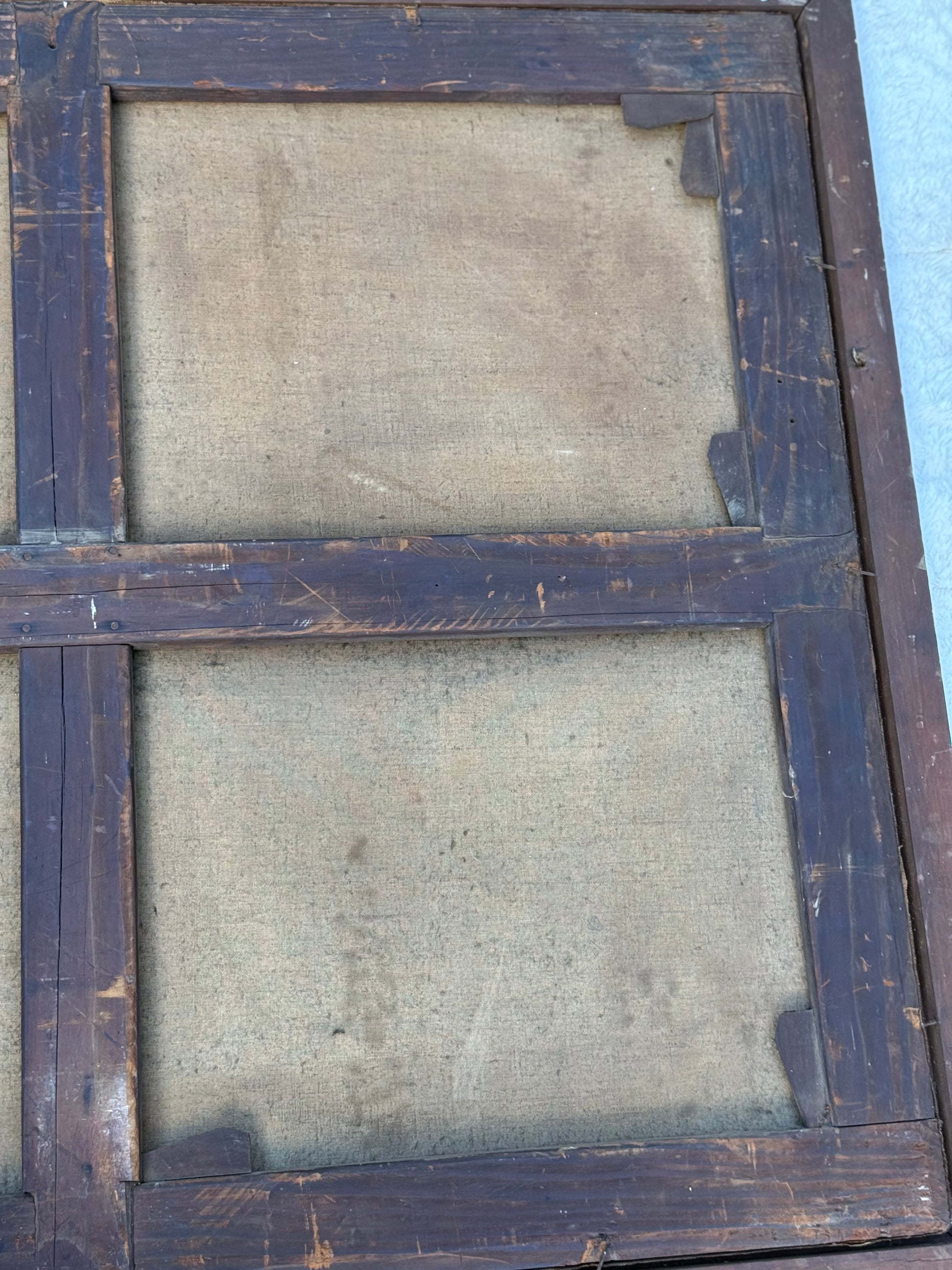 The canvas remains on its original four-crossbar mid-19th century stretcher, with early machine-cut wedges and warm oxidation confirming the period. The scale alone makes this an extraordinary statement piece—dramatic, imposing, and full of old-world narrative tension. A professional cleaning would dramatically brighten the underlying palette should a future owner wish to reveal its original color.