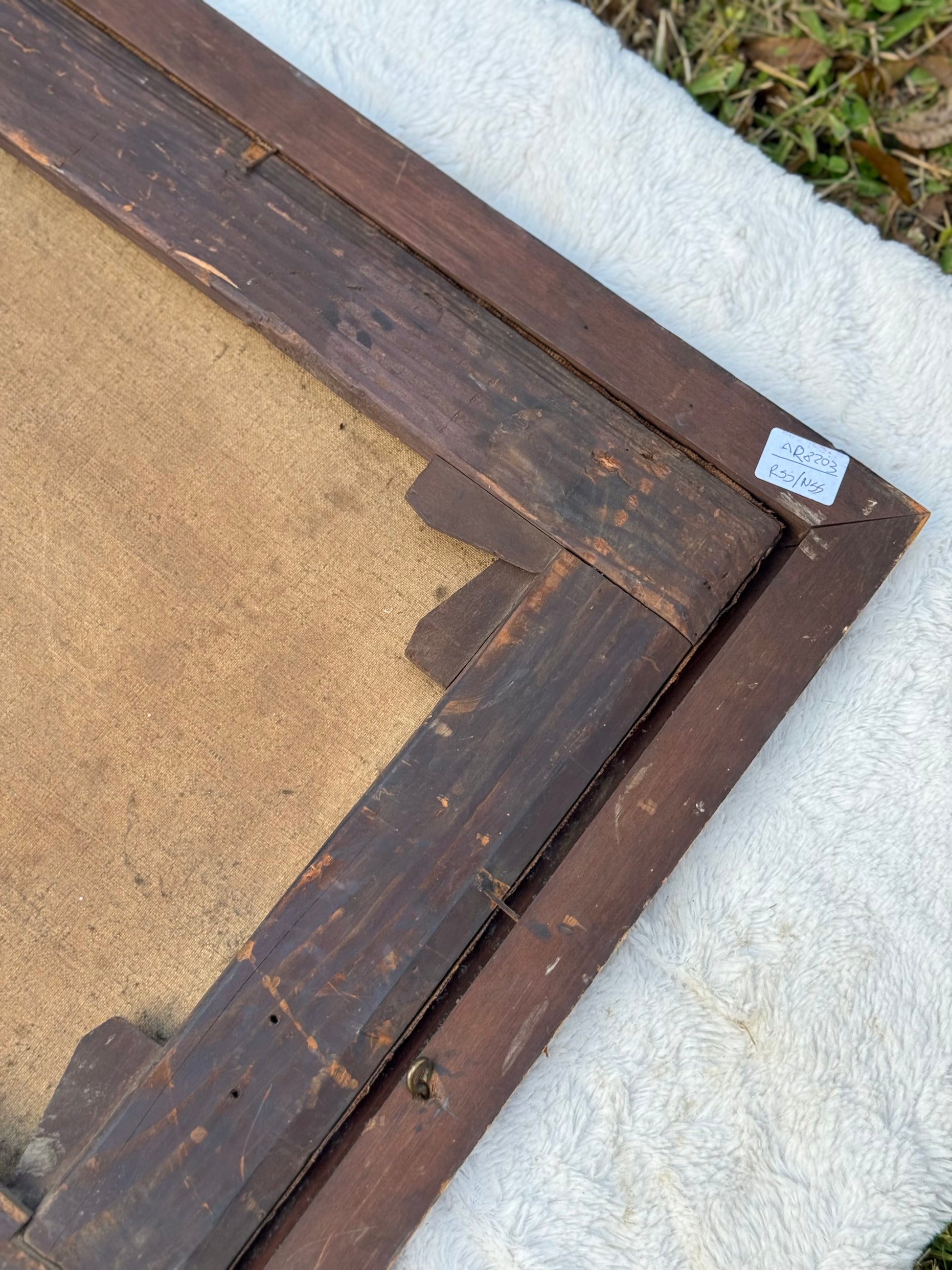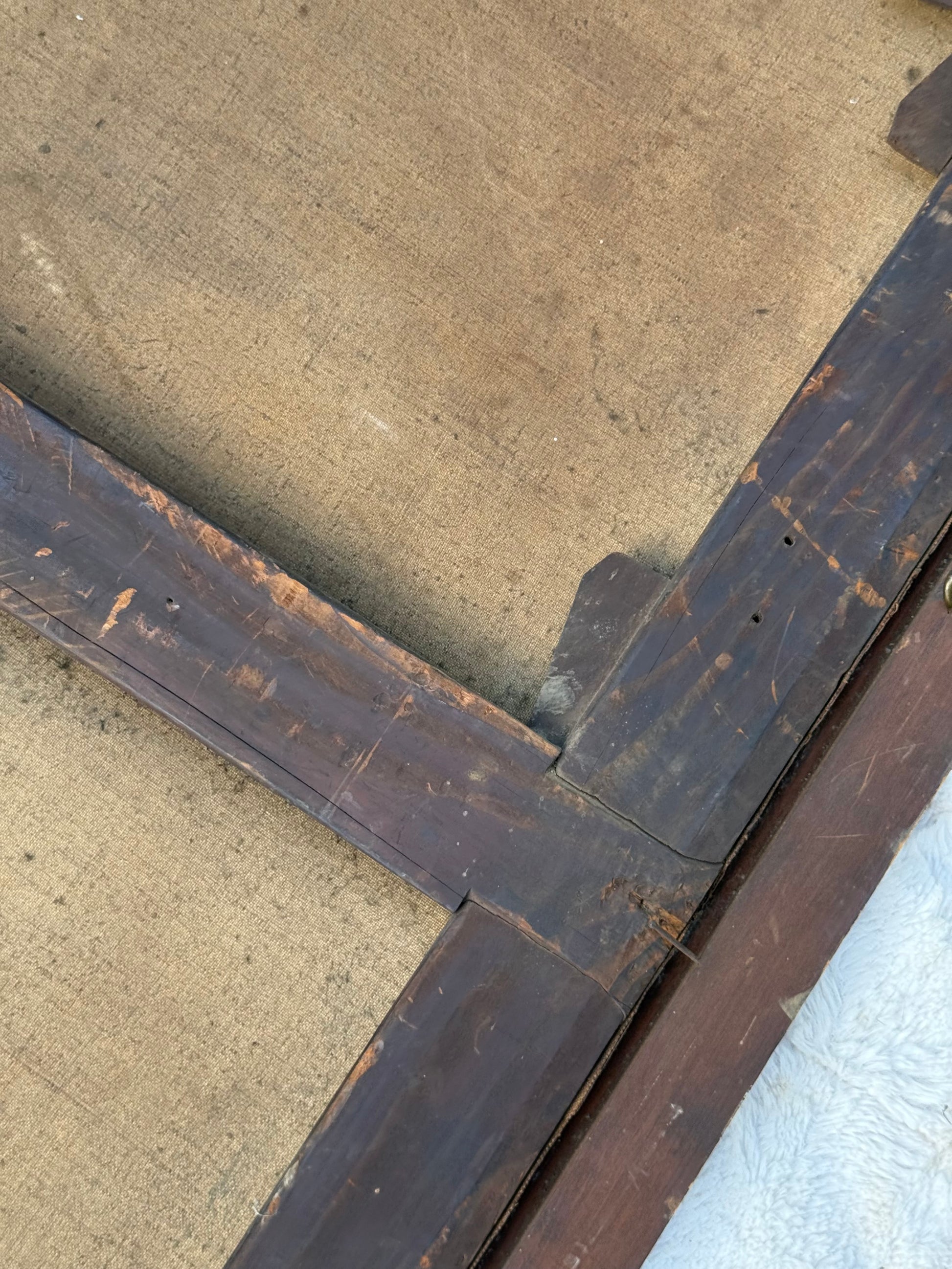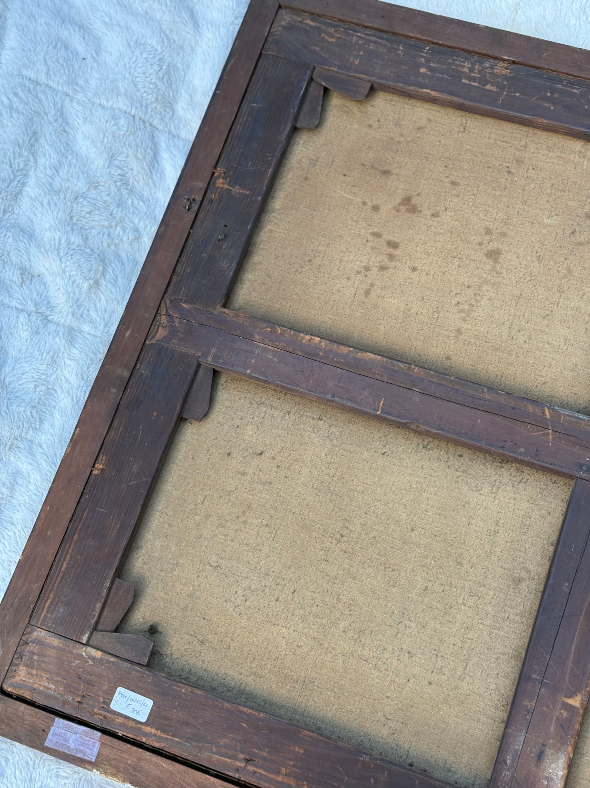 The canvas remains on its original four-crossbar mid-19th century stretcher, with early machine-cut wedges and warm oxidation confirming the period. The scale alone makes this an extraordinary statement piece—dramatic, imposing, and full of old-world narrative tension. A professional cleaning would dramatically brighten the underlying palette should a future owner wish to reveal its original color.