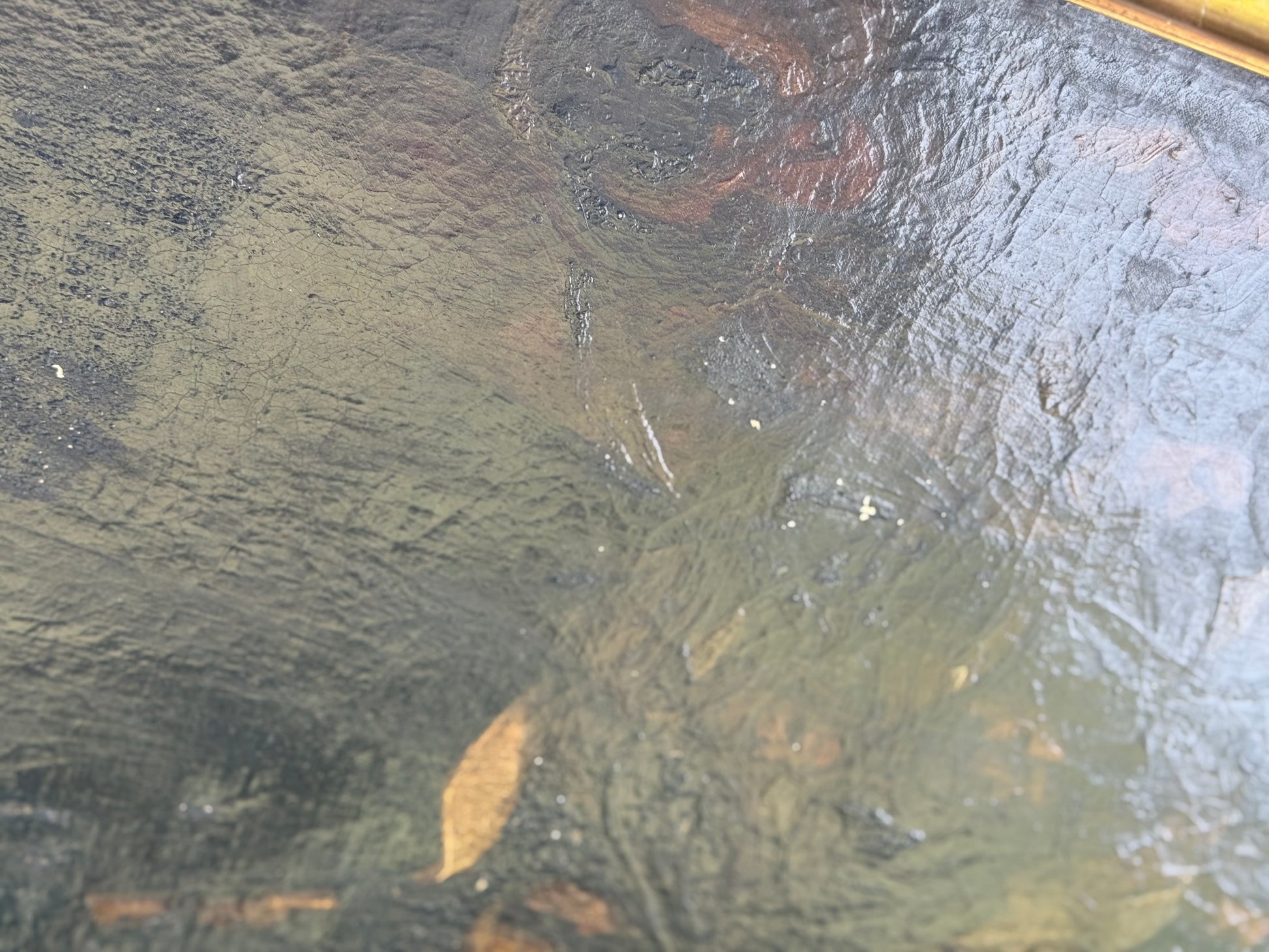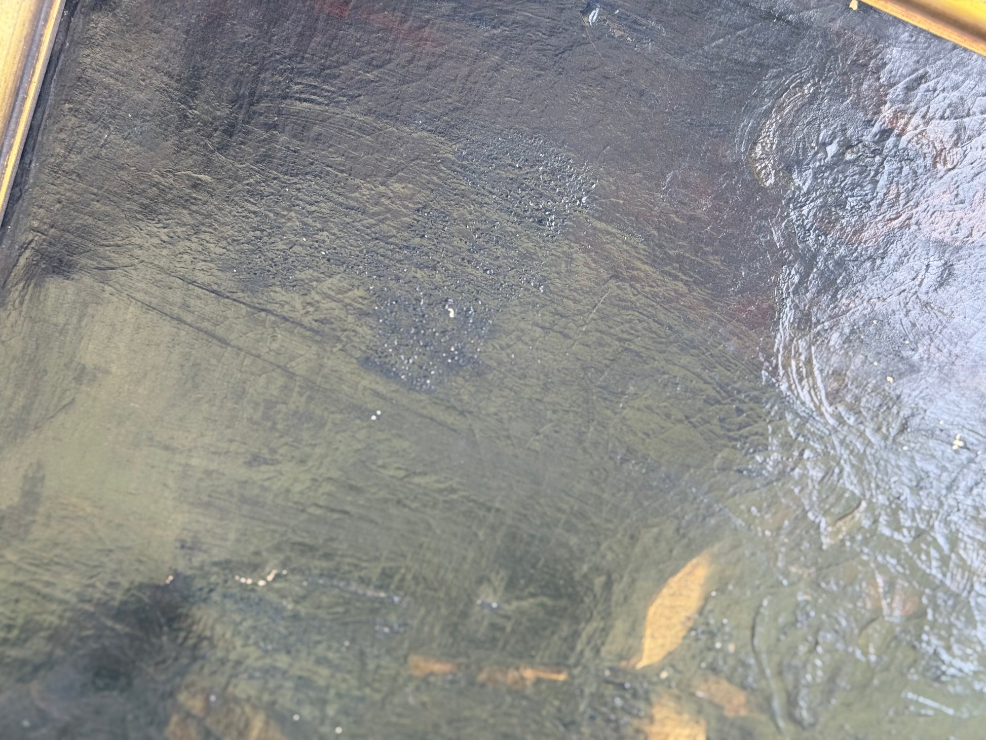 The surface retains its original glossy 19th-century natural resin varnish, giving the work a luminous, almost stage-lit sheen. The varnish has naturally darkened with age, softening the finer details beneath and creating a moody, atmospheric weight that fits the subject perfectly. Craquelure throughout is consistent with authentic mid-century oils.