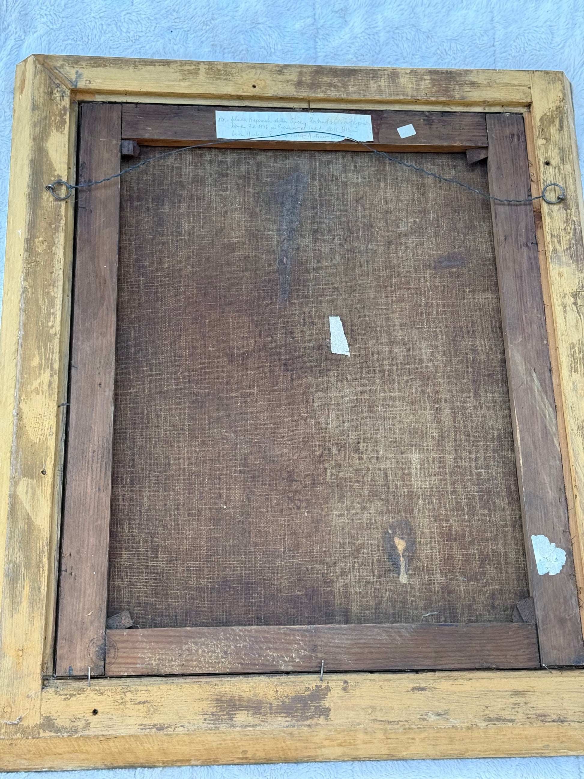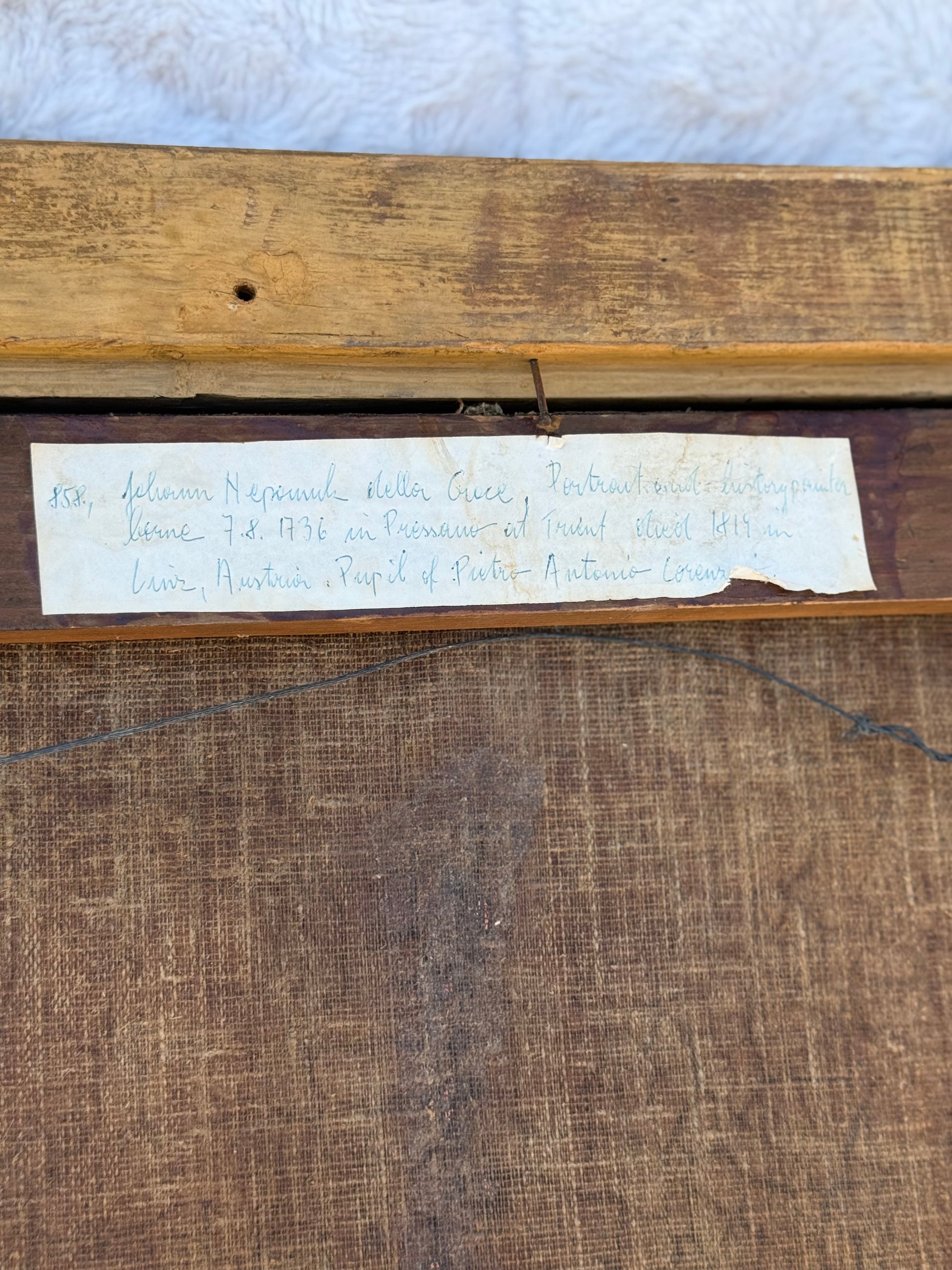 On the reverse is an old European handwritten collection label, written in 19th/early-20th century script, identifying the artist as Johann Nepomuk della Croce (1736–1819) — a respected portraitist active in the Austrian and Northern Italian regions. The biography written on the label is accurate to della Croce’s documented life, suggesting the painting once belonged to a European family collection or early catalogued estate. A circular restorer or framer’s stamp on the stretcher further supports long-term European ownership.