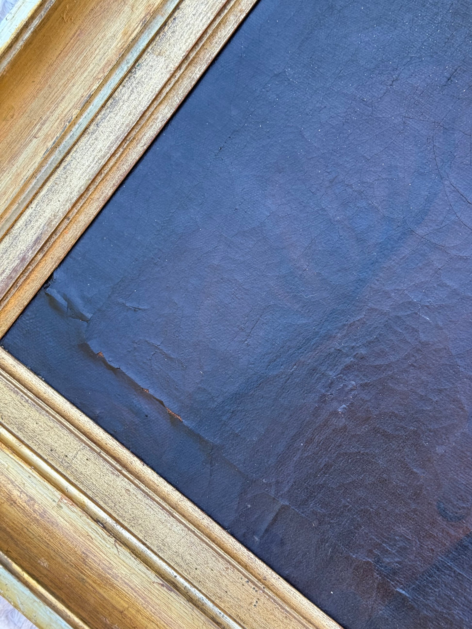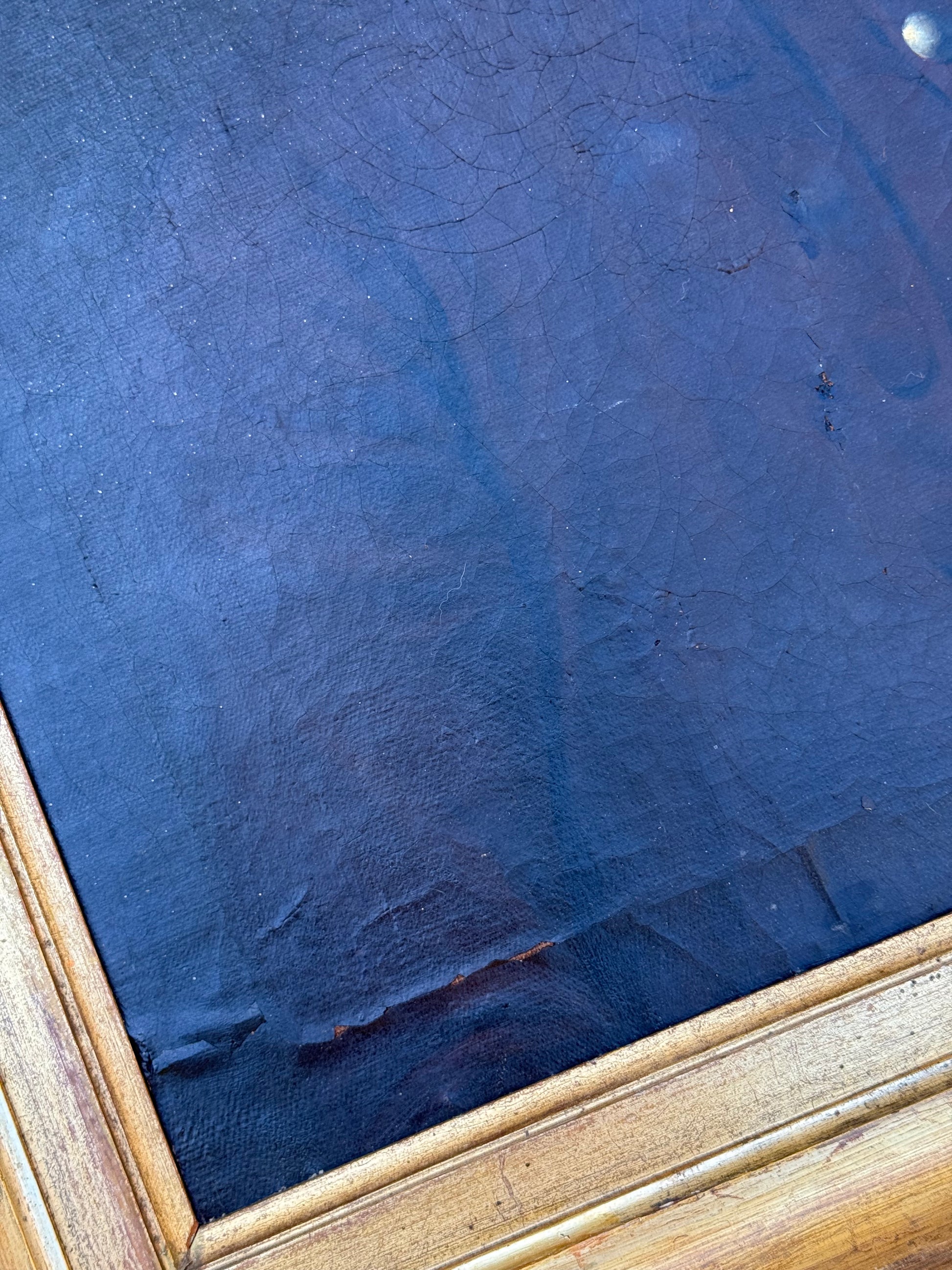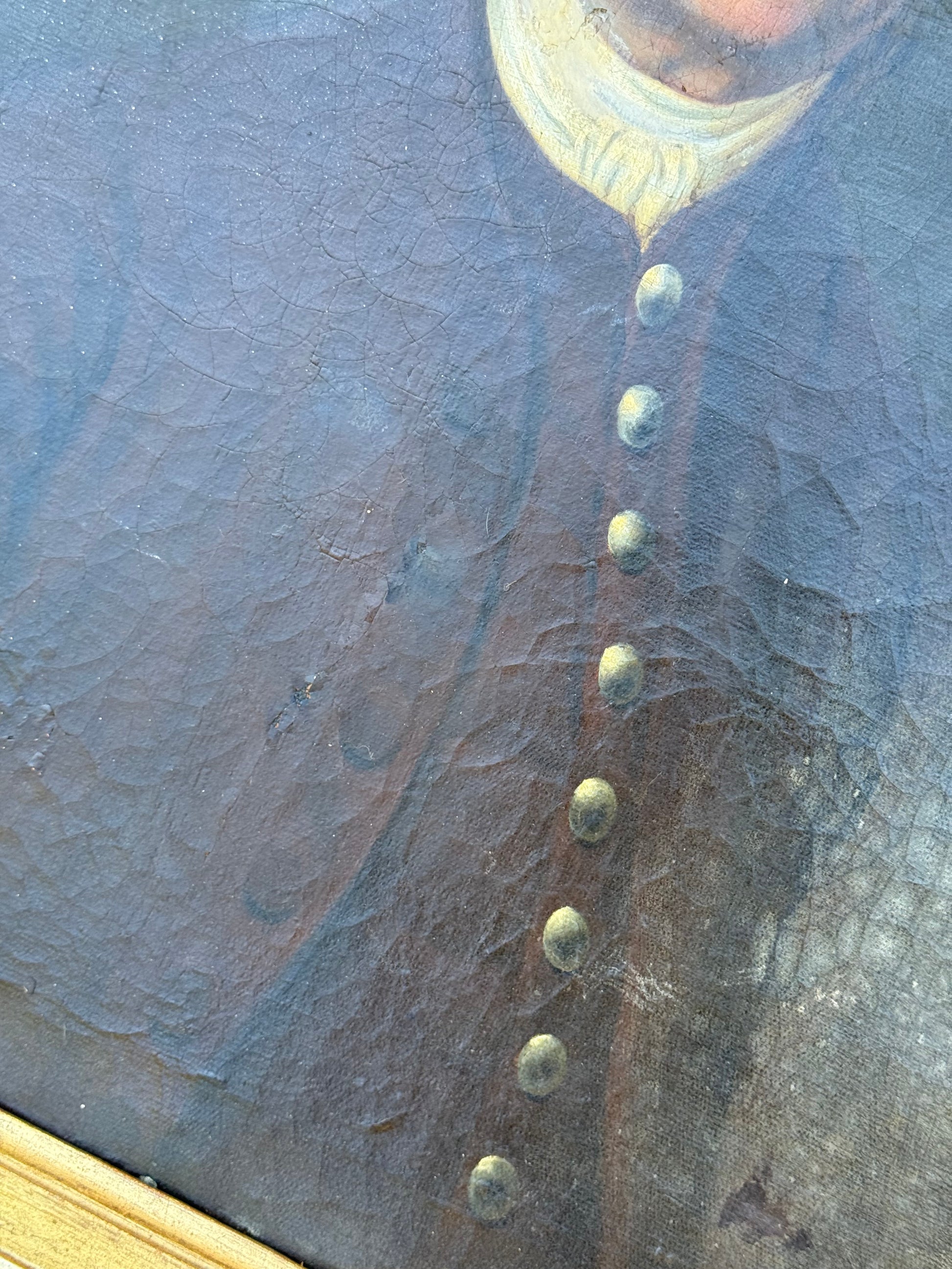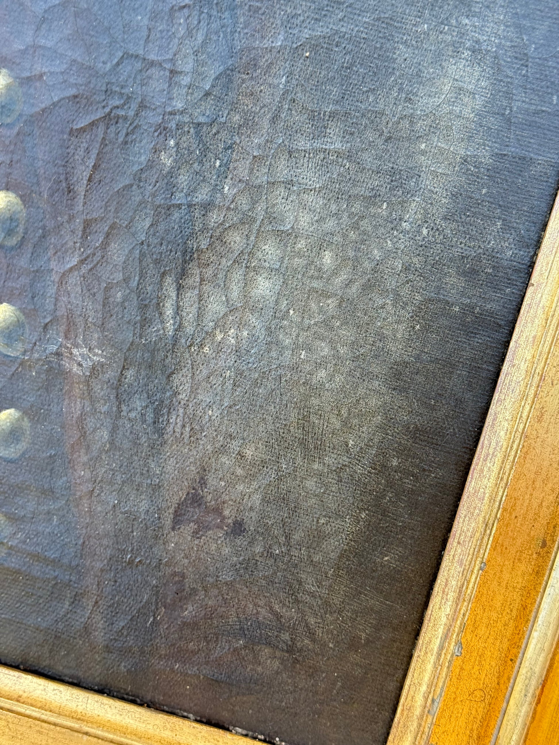 The painting shows areas of age-consistent craquelure throughout, some lifting in the paint layer, and evidence of historical restoration on the reverse. The gilded frame is original to the period, with surface wear and losses appropriate to its age. Together, the painting and frame present with the warm, authentic presence expected of an 18th-century portrait.