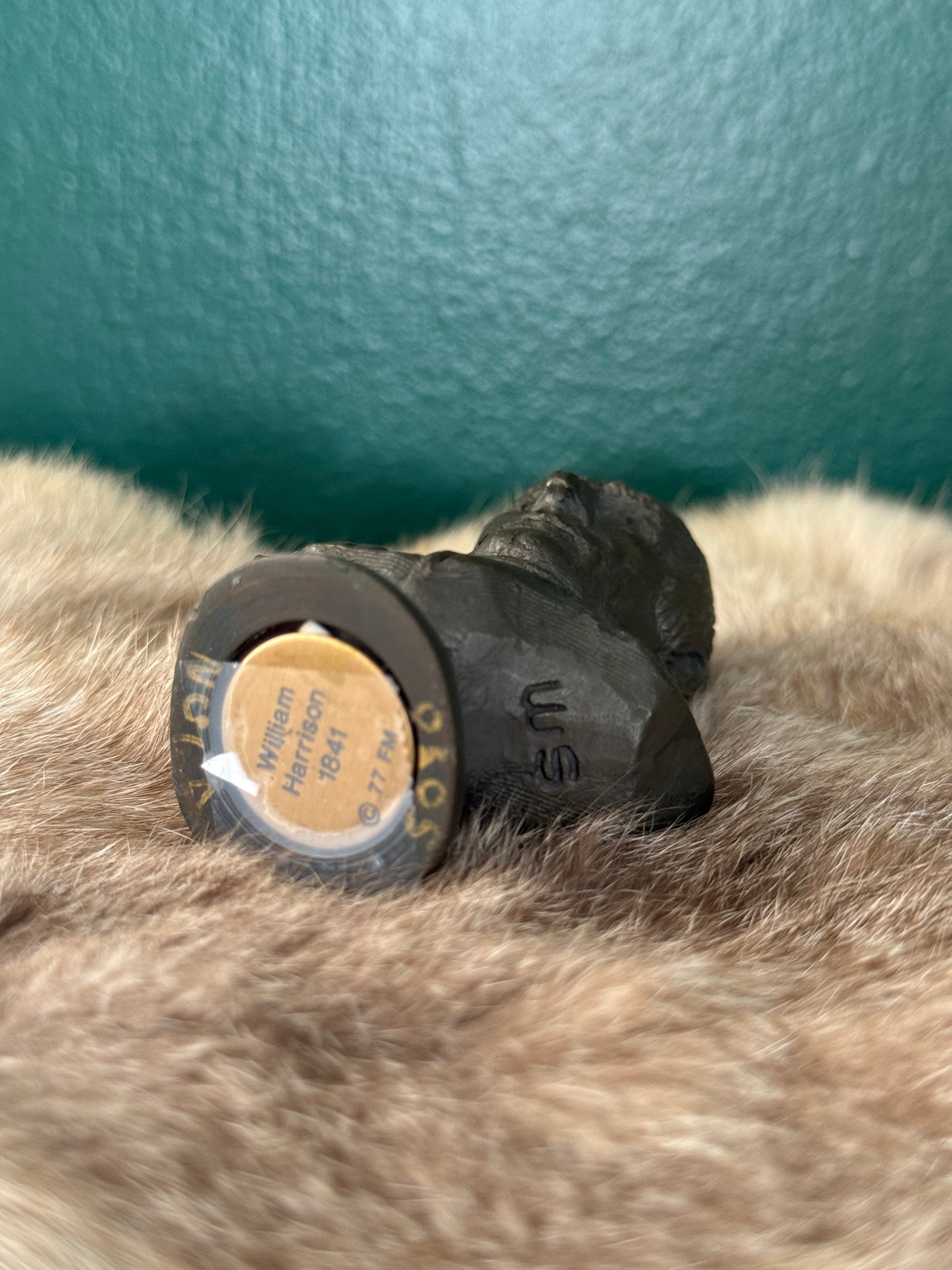 Vintage miniature bust depicting William Henry Harrison, 9th President of the United States, with finely modeled facial features and period-appropriate dress. The underside retains its original identification plaque reading “William Henry Harrison 1841,” along with production markings consistent with Franklin Mint–style presidential series pieces.